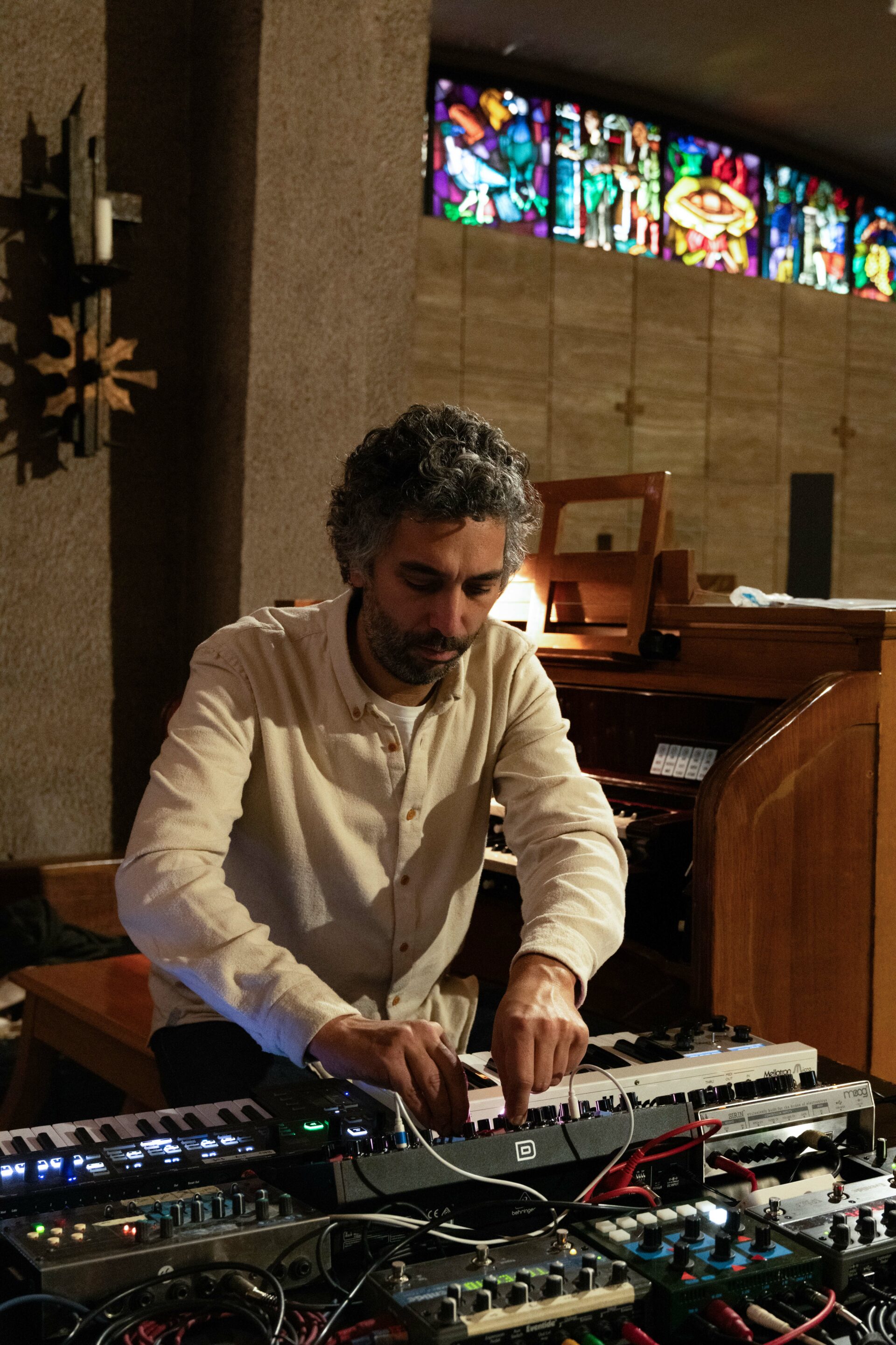 Using synthesizers, a looper, and sound effects, the artist explores the fusion between electronic and acoustic sound, focusing on timbral matter and the immersive dimension of listening.